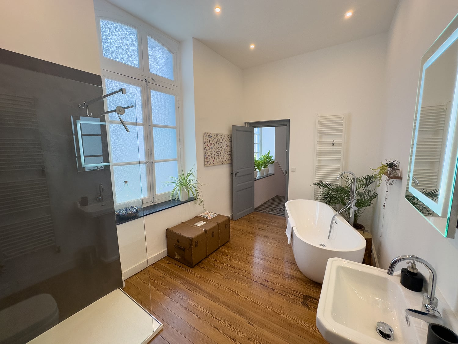 Salle de bain séparée avec WC, baignoire, douche séparée et lavabo.