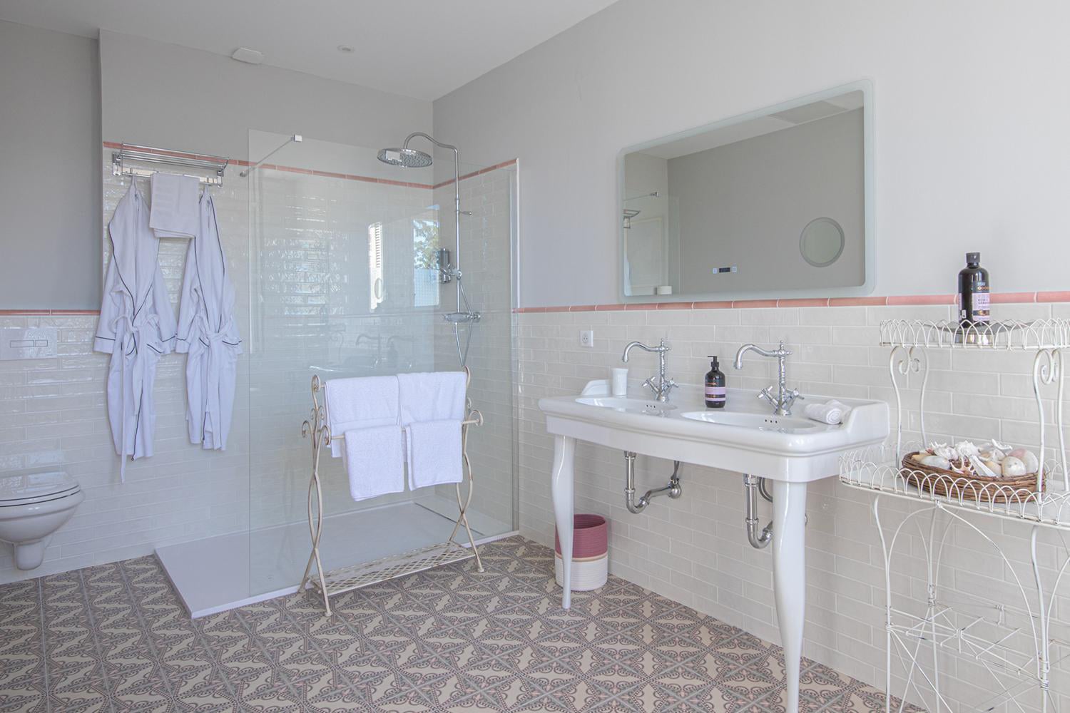Chambre 1, grand lit double avec salle d'eau en suite avec WC, douche et lavabo double vasques.