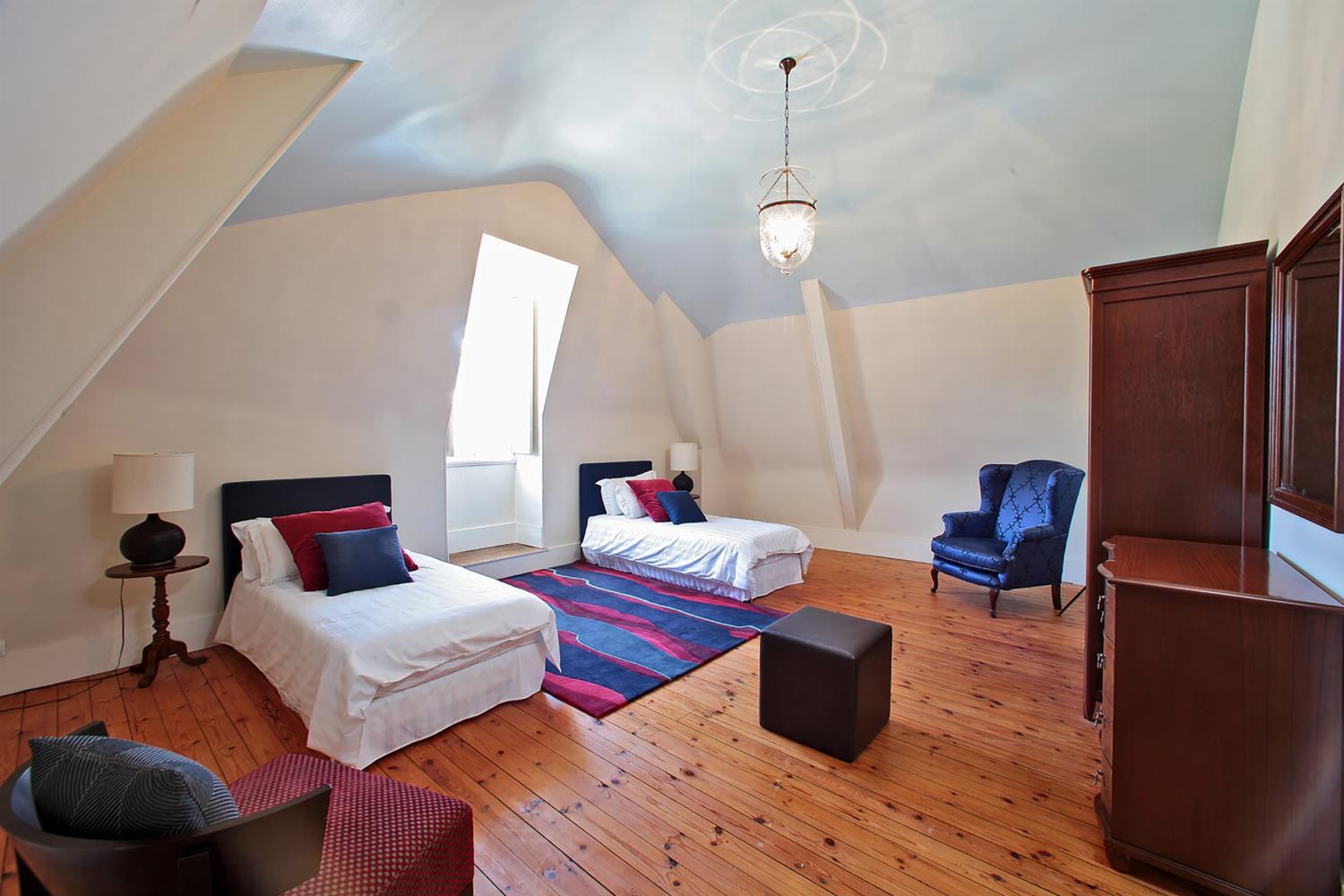 Chambre 5, avec cheminée, lucarnes, grand lit double, banquette, bergère, chaise lounge, table basse, armoire encastrée avec étagères, bureau et chaise. Salle d'eau en suite avec WC, grande douche à l'italienne, lavabo et sèche-serviettes.