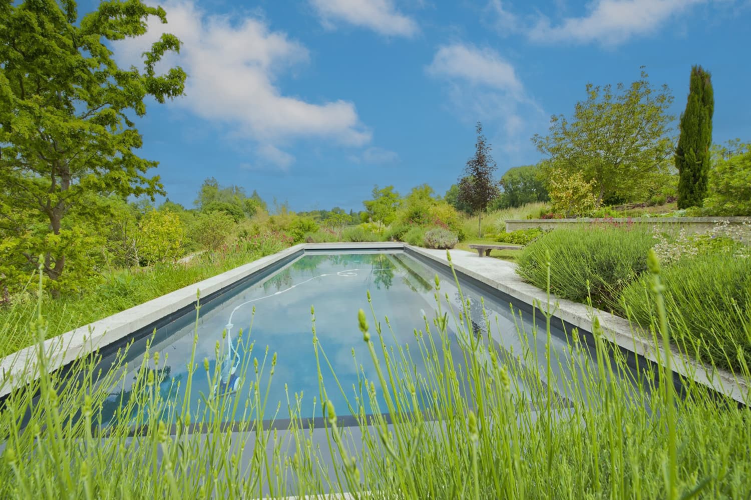 Un hectare de terrain privé avec de vastes pelouses et une fontaine, l'ensemble donnant sur la campagne.