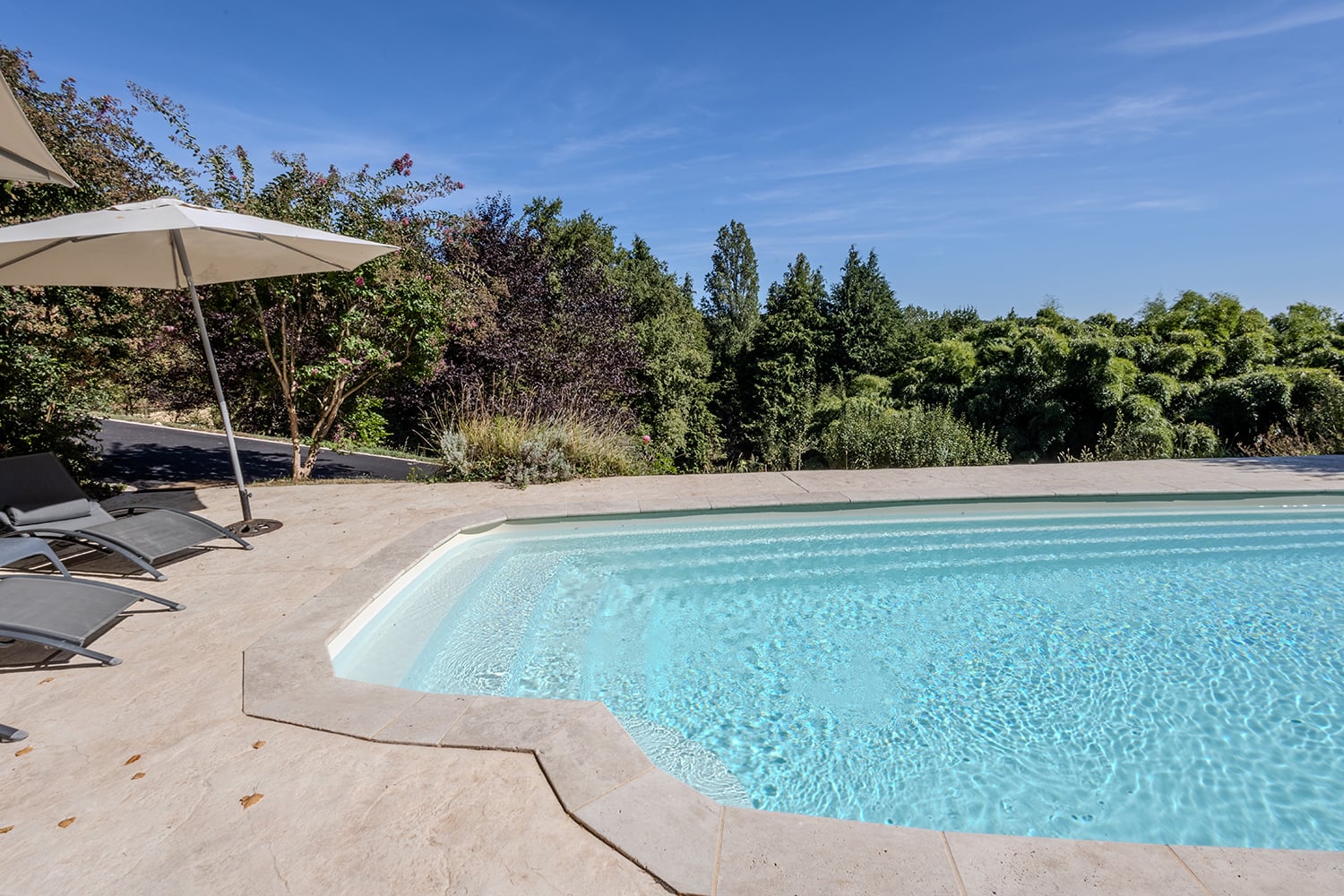 Piscine privée de 11 m x 4 m avec solarium et bains de soleil.