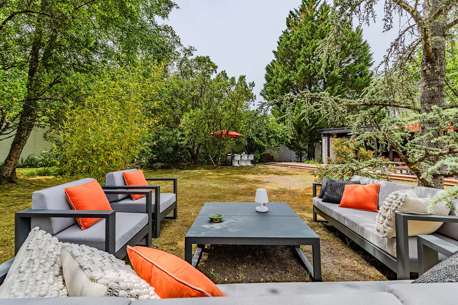 Terrasse avec table et chaises, espace salon extérieur et bains de soleil.