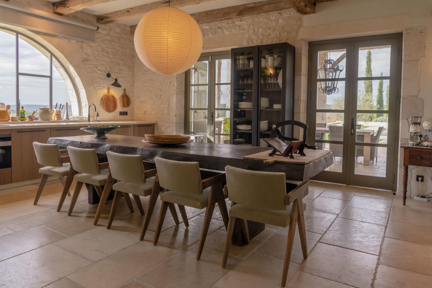 L'entrée donne sur la cuisine contemporaine avec de grandes fenêtres et des vues spectaculaires. Les portes ouvrent sur une terrasse ombragée pour les repas et sur la piscine.