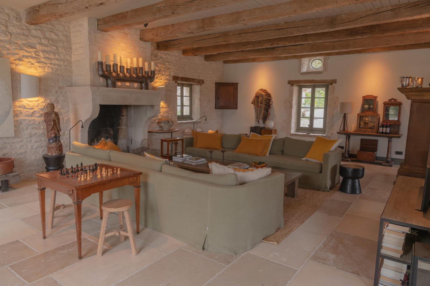 Salon et salle à manger avec table et chaises, cheminée, TV, lecteur DVD et internet Wi-Fi.