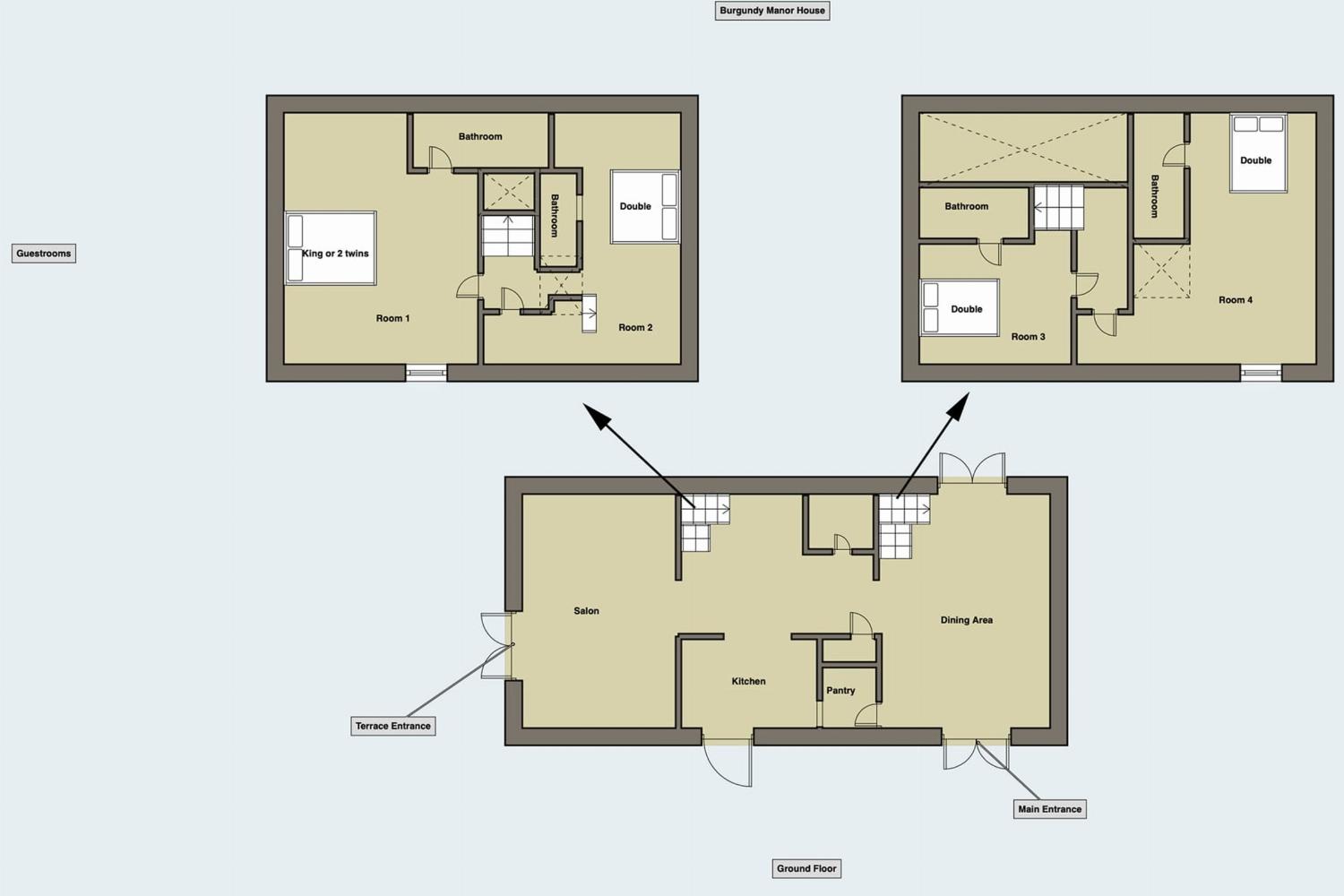 Deux escaliers mènent aux ailes du premier étage, chacune avec deux chambres doubles, toutes deux avec salle de bain en suite et climatisation.
